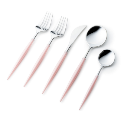Elevate your table setting with Decor's Noble Collection Pink & Silver Disposable Cutlery Combo. This package includes 16 forks, 8 spoons, 8 knives, and 8 teaspoons, providing a complete set for your dining needs. The pink and silver finish gives these utensils an elegant appearance, making them perfect for special occasions. Despite their disposable nature, they resemble real cutlery, adding sophistication to any event without the hassle of cleanup.