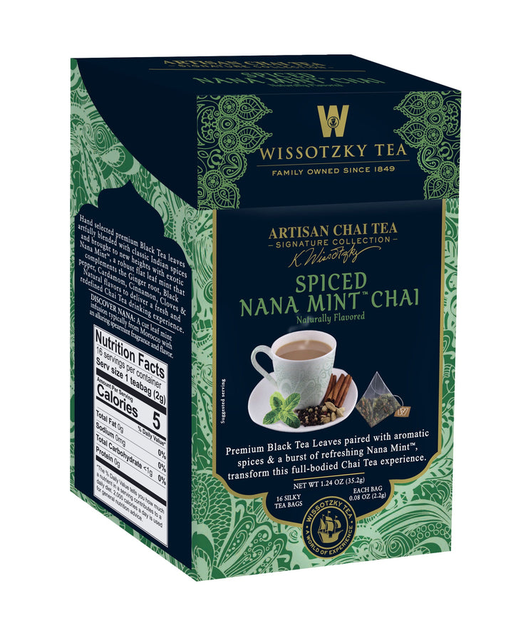 Hand selected premium Black Tea leaves artfully blended with classic Indian spices and brought to new heights with exotic Nana Mint, a robust flat leaf mint that compliments the Ginger root, Black pepper, Cardamom, Cinnamon, Cloves & Natural flavors to deliver a fresh and redefined Chai Tea drinking experience.